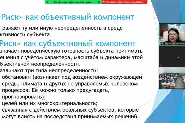 Лекции, проведенные в онлайн-формате, охватывали такие актуальные темы, как «Влияние рисков на социально-экономическое развитие страны и механизмы их нейтрализации» и «Роль менеджмента и управления рисками в повышении эффективности бизнеса». Занятия позволили студентам углубить теоретические знания по управлению рисками на уровне субъектов хозяйствования, а также на уровне государства. Особенно интересовали студентов современные механизмы нейтрализации рисков, таких как страховая защита, хеджирование и диверсификация, что является крайне актуальным в условиях динамично меняющегося мирового рынка.